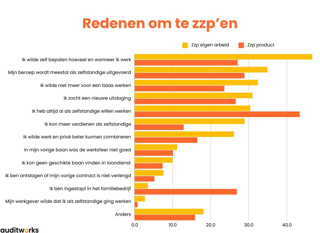 In 2023 werd door het CBS en TNO gepeild waarom mensen zzp’er worden. De meeste zzp’ers wilden zelf bepalen hoeveel en wanneer ze werkten, hebben altijd al als zelfstandige willen werken of hebben een beroep dat meestal als zzp’er gedaan wordt. Weinig zzp’ers gaven aan dat ze uit noodzaak zelfstandige zijn geworden. Voor de meeste zzp’ers is het dus echt een bewuste keuze.