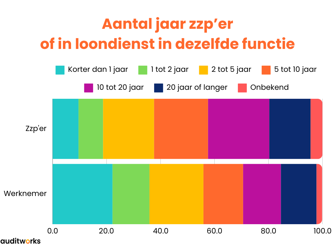 En als mensen eenmaal zzp’er zijn, dan houden ze dat langer vol dan het gemiddeld aantal jaar in loondienst. Zzp’ers werken gemiddeld 9,8 jaar in hun eigen bedrijf, terwijl een werknemer slechts 7,8 jaar in één functie werkt.
