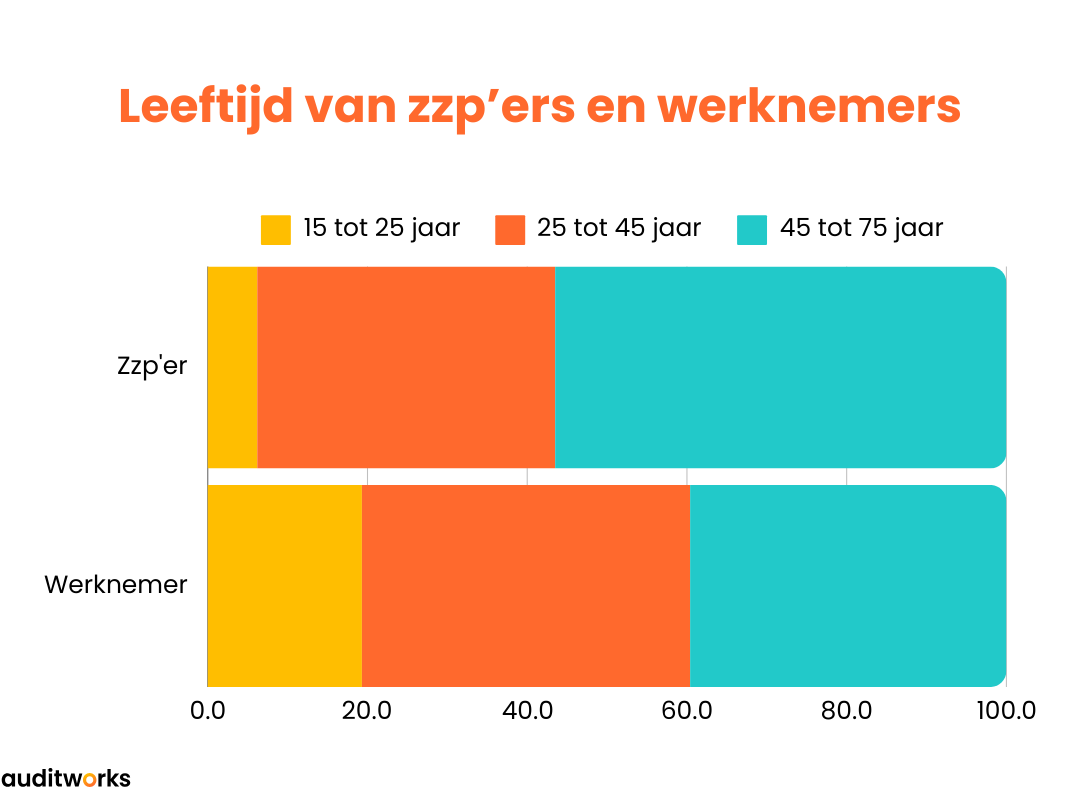 Zzp’ers zijn vaak ouder dan werknemers. 57% van de zzp’ers is tussen de 45 en 75 jaar oud. Slechts 6% van de zzp’ers is 15 tot 25 jaar oud, terwijl die leeftijdscategorie 19% van de werkenden in loondienst vertegenwoordigt.