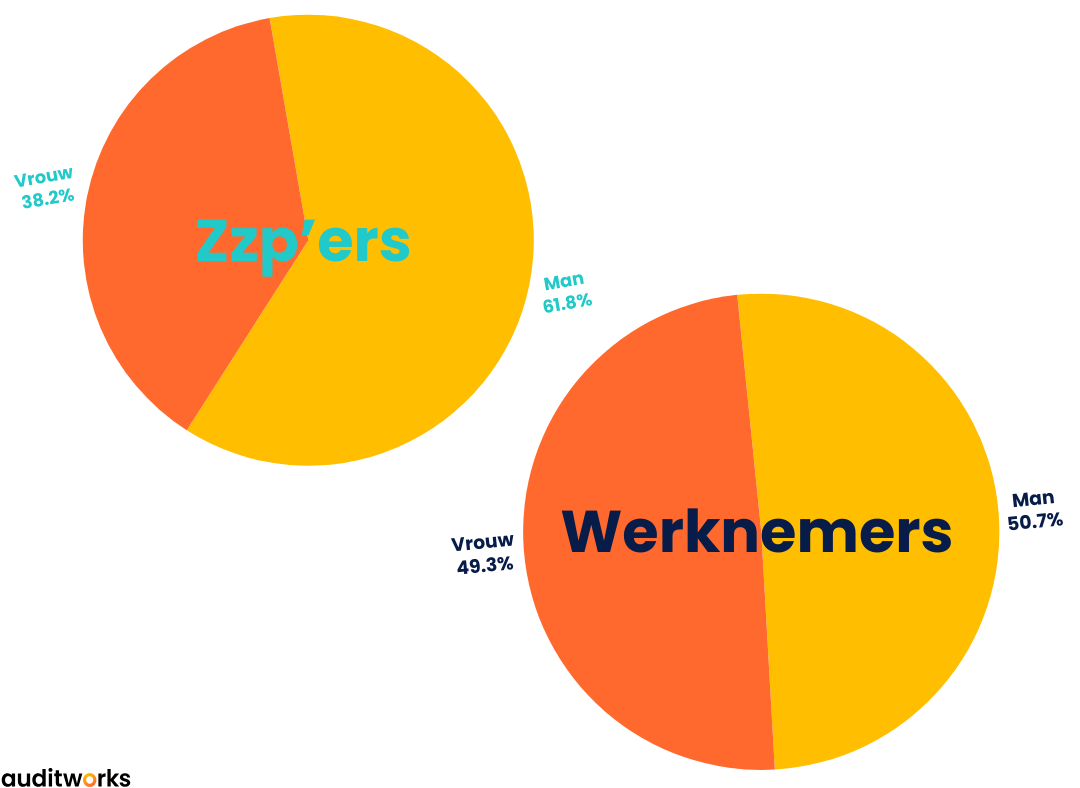 Zzp’ers zijn vaker man dan vrouw, namelijk 62 om 38 procent in 2023. Bij werknemers is de helft man, de helft vrouw.